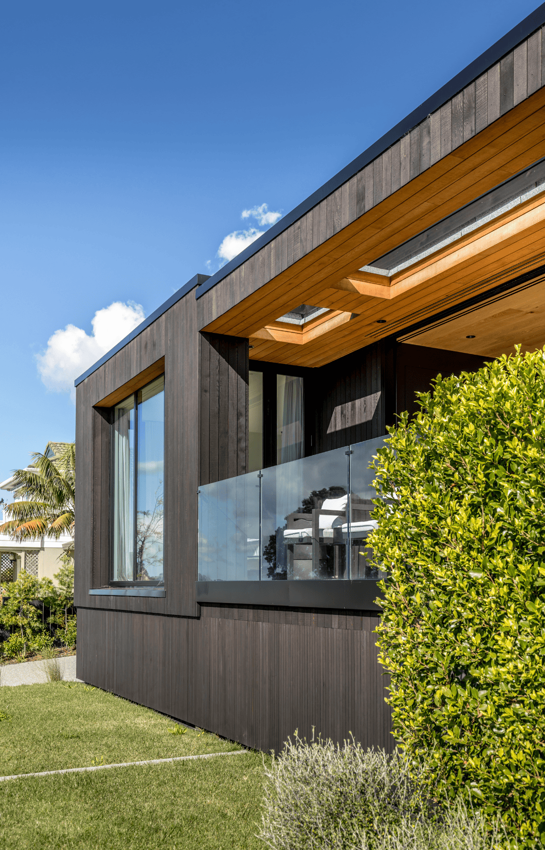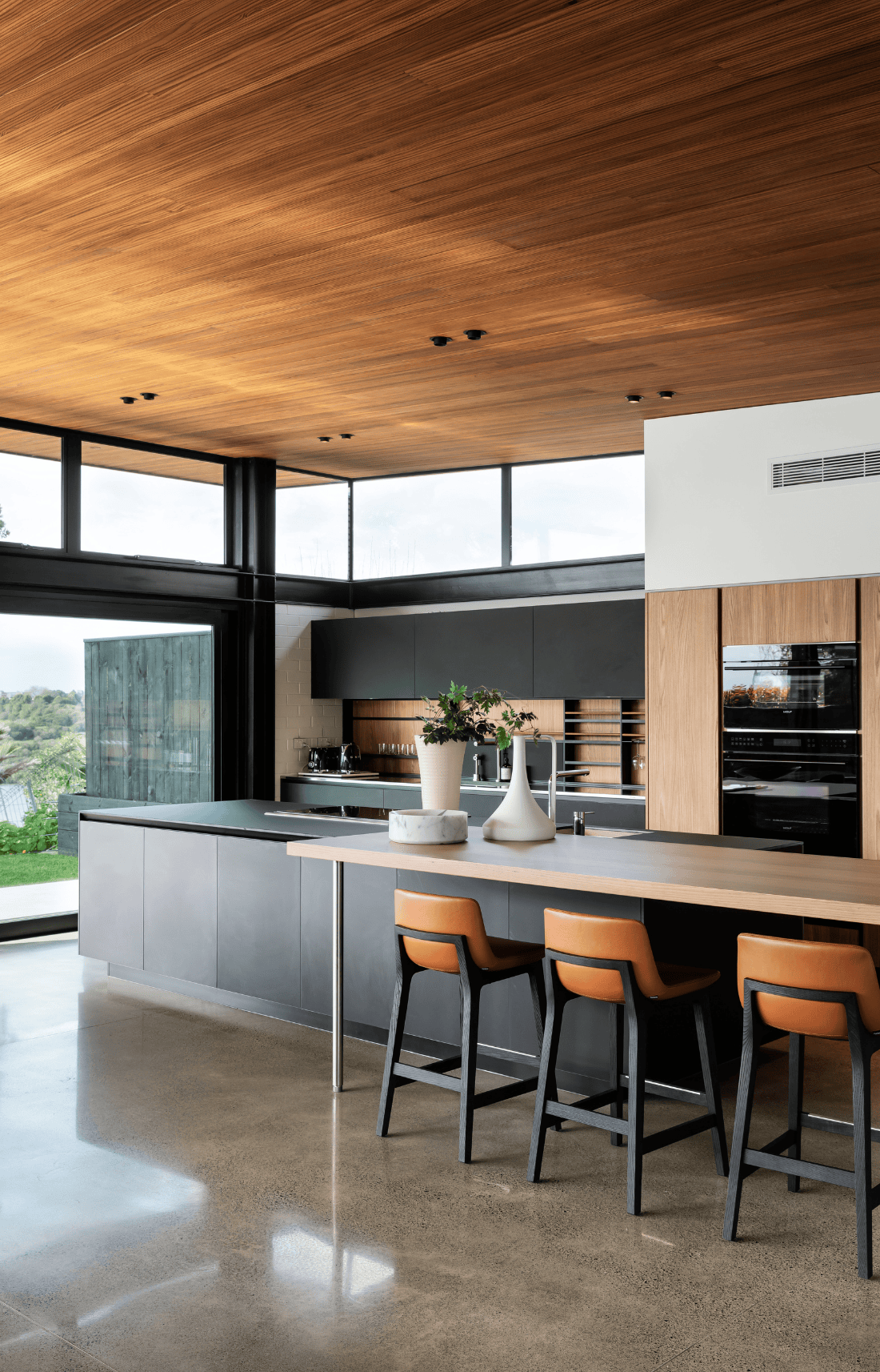 The original home was reclad, the roof structure modified, and a few internal walls removed to enable a new use of the space. The architects cleverly repurposed the back of the property by removing the old garaging, which the neighbor now uses for storage, and created a new boat shed integrated with a guest wing with two bedrooms that embrace a charming courtyard garden. Vertical Abodo Vulcan Nero cladding, designed to complement the verdant hills surrounding the property, and a new charcoal roof transformed the home, ready for Yvette’s master touch with the interior redesign.